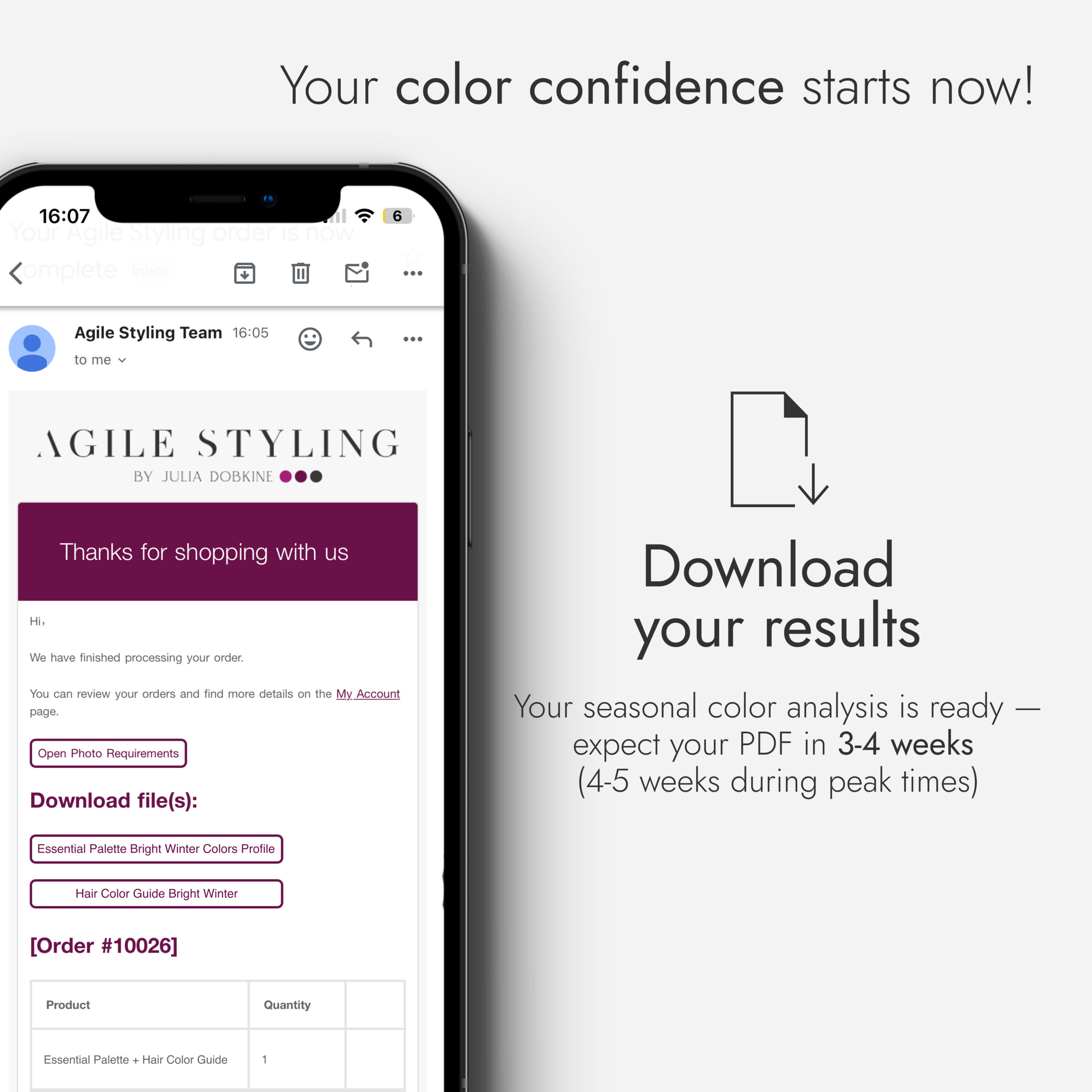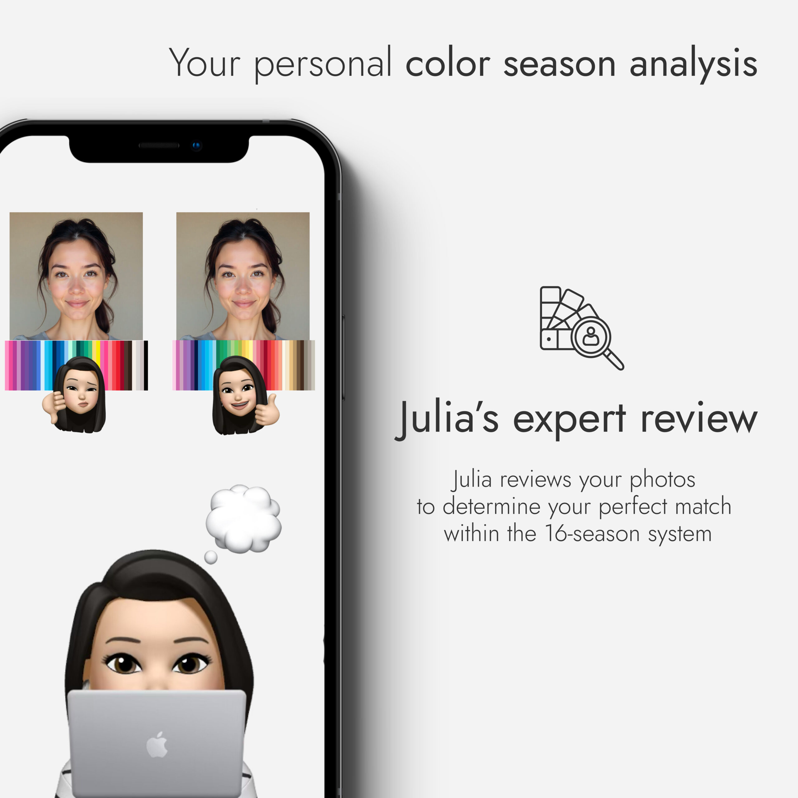 Using Julia Dobkine’s professional 16-season color analysis system, you’ll receive a digital package that reveals your perfect palette and the shades that harmonize beautifully with your natural coloring.