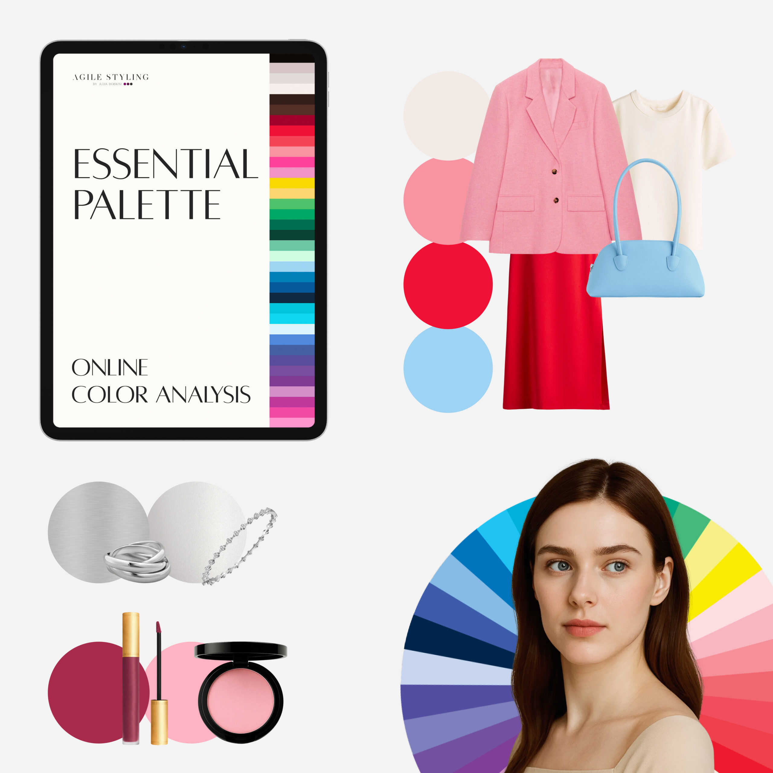 The Essential Palette is your personalized color roadmap—featuring 35-40 curated shades for your season, plus key guidance on how to use them for clothing, hair, makeup, jewelry and accessories choices that truly flatter you. If youʼve ever wondered how to choose colors that suit your natural tones, this service goes beyond a simple Essential palette analysis quiz—youʼll receive a professional consultation and customized results.