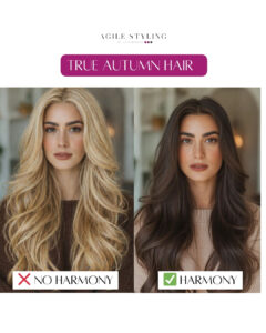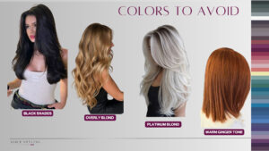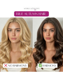 Hair colors to avoid include anything too golden, brassy, icy, or overly ashy — these disrupt the delicate balance of a neutral autumn skin tone color palette.